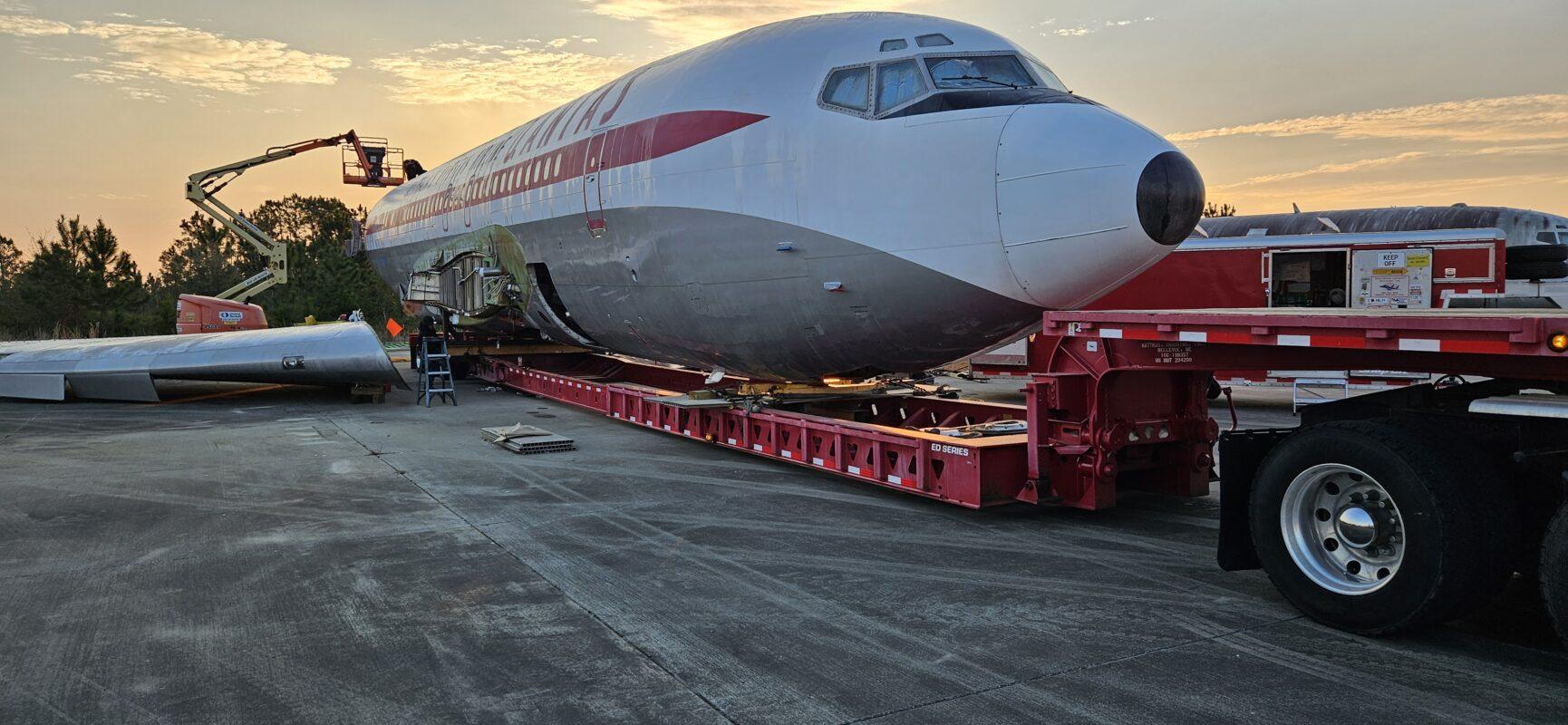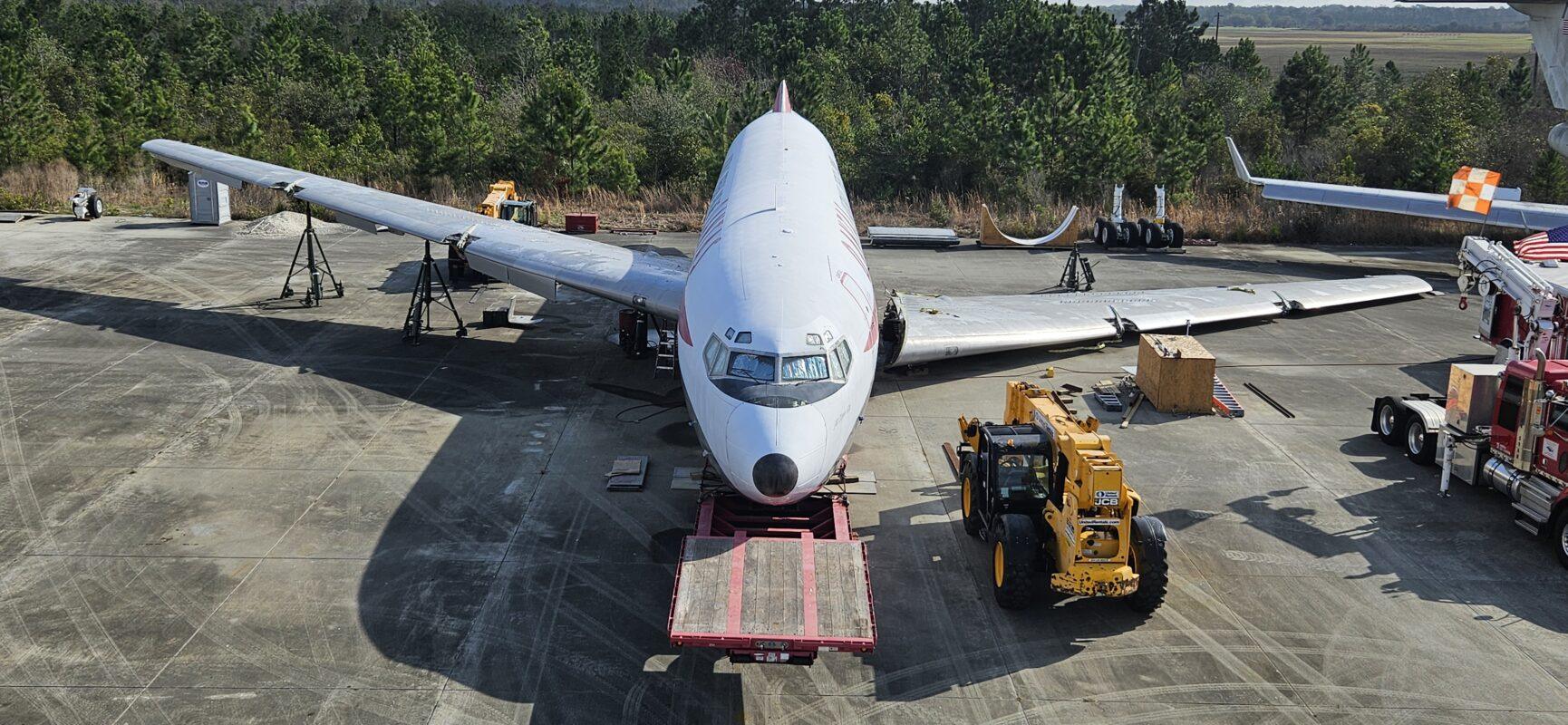 In 2024 we were contacted by HARS Aviation Museum in Albion Park, Australia to look at a Boeing 707 that was donated to the museum. After looking at and getting a game plan we decided to go ahead and accept the challenge. From that time a team from Australia and the help from Stambaugh Aviation removed the vertical and horizontal stabs, flaps, ailerons and many panels. In December of 2025 our team arrived on site in Brunswick GA at the Brunswick Golden Isles Airport to begin removing the wings. After removing the wings from the center section, the aircraft was delivered to the port in Brunswick GA on March 20th, 2026. From there it will make a long journey to Australia where it will be reassembled for display. The wonderful folks from Australia are planning to go through the aircraft once it is reassembled and have it to able to taxi around.